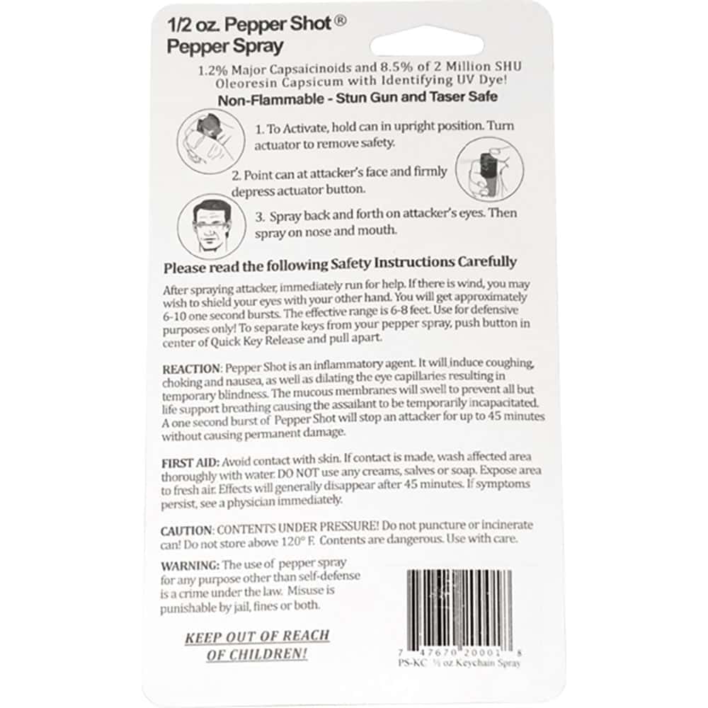 Pepper Shot 1.2% MC ½ oz pepper spray belt clip and quick release keychain. Pepper Shot Pepper Spray is made with 1.2% Major Capsaicinoids. The Major Capsaicinoids are the true heat measure and Pepper Shot 1.2% MC is more effective than of most other pepper sprays. In addition to causing an attacker pain, The Pepper Shot 8.5% oleoresin capsicum formula swells the mucous membranes, which makes breathing difficult, and swells the veins in the eyes, causing the eyes to close. It’s made from 2,000,000 SHU’s of raw pepper and these effects can last up to 45 minutes and cause no permanent damage. Has a UV identifying dye to help aid in the identification of an attacker. ½ oz keychain model with locking actuator and quick release keychain.